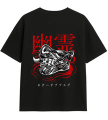 Kara ve beyaz tonlarda hazırlanmış şeytani maskeyle öne çıkan ürkütücü bir tasarım. Arka plandaki kırmızı kanji detayı gücü artırır.