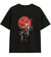 Katana koleksiyonunu sırtlayan yalnız savaşçı, kırmızı güneş fonunda dimdik duruyor. Sadakat ve onurun estetikle buluştuğu t-shirt.