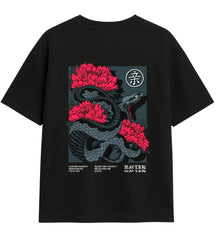 Parlak kırmızı çiçekler arasında sinsice süzülen yılan… Tehlike, gizem ve cazibeyi aynı anda yansıtan güçlü bir tasarım. Cesur ruhlar için.