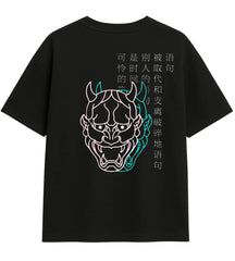 Neon çizgilerle tasarlanmış Japon Oni maskesi, geleneksel ile moderni buluşturuyor. Anime ve cyberpunk severler için ideal bir t-shirt.