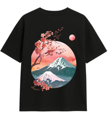 Gün batımı tonlarında Fuji Dağı, pembe kiraz çiçekleriyle birleşiyor. Romantik ve huzurlu bir tasarım.