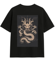 Koyu arka plan üzerinde parlayan altın çizimler, gecenin gizemini ve ejderhanın kudretini anlatır.