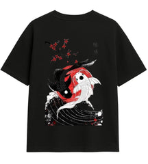 Kırmızı güneşin önünde siyah ve beyaz koi balıkları. Yin ve yang dengesinin Japon kültürüne özgü yorumu.