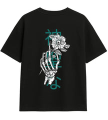 İskelet elinden çıkan tek bir çiçek… Ölüm ve yaşamın kusursuz dengesini temsil eden sanatsal bir tasarım.