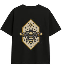 Altın ve siyah tonlarda arı motifi, kovan geometrisiyle birleşerek t-shirt'e oturuyor. Gücü, çalışkanlığı ve doğayı simgeleyen zarif bir tasarım.